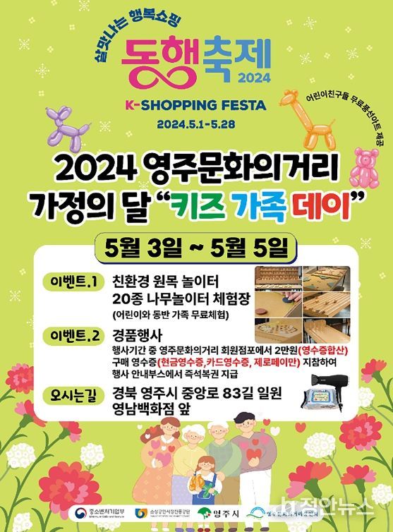 정안뉴스 안정주 기자 | 영주시는 3일부터 5일까지 영주문화의거리(중앙로 83번길 일원)에서 문화시장상인회 주관으로 ‘5월 동행축제 키즈가족데이’ 행사를 진행한다고 밝혔다.