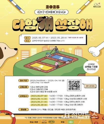 프로그램에 관심 있는 관내 반려인은 4월 18일까지 금천구청 누리집이나 홍보물의 정보무늬(QR코드)에 접속해 신청서를 제출하면 된다. 회차별 15명(15마리)까지 선착순으로 모집한다. 단, 반려견은 동물 등록이 되어 있어야 하며, 맹견은 신청할 수 없다.
