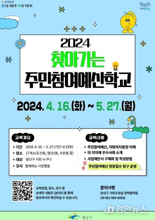 정안뉴스 박상욱 기자 | 광주 광산구는 주민참여예산제에 대한 시민의 이해와 참여를 높이기 위해 수요자 중심의 ‘찾아가는 주민참여예산학교’를 운영한다고 밝혔다.