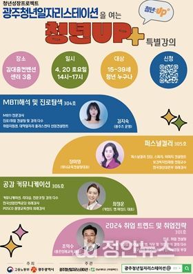 정안뉴스 박상욱 기자 | 광주광역시는 구직에 어려움을 겪는 청년들이 자기 이해를 통해 취업 전략을 설계할 수 있도록 ‘청년 업(UP)+’ 특강을 오는 20일 오후 2시 김대중컨벤션센터에서 연다.