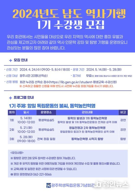 정안뉴스 박상욱 기자 | 광주학생독립운동기념회관이 오는 24일부터 내달 8일까지 시민들을 대상으로 ‘남도 역사기행’ 1기 수강생을 모집한다.