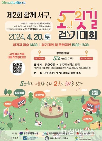 정안뉴스 박상욱 기자 | 광주광역시 서구는 오는 20일 광주천 일대에서 주민들과 함께 5.2㎞의 기적을 만드는 ‘제2회 함께 서구, 오잇길 걷기대회’를 개최한다.