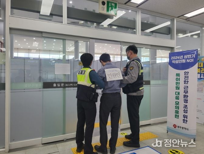 정안뉴스 박상욱 기자 | 광주광역시는 24일 시청 민원실에서 민원인의 폭언‧폭행 등 특이민원으로부터 민원 담당 공무원을 보호하고 안전한 민원환경 조성을 위해 ‘특이민원 대응 모의훈련’을 실시했다.