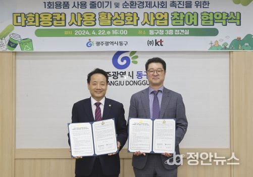 정안뉴스 박상욱 기자 | 광주 동구는 1회용품 사용 줄이기를 위해 지난 22일 ㈜KT와 ‘다회용컵 사용 활성화’ 협약을 체결했다고 밝혔다.