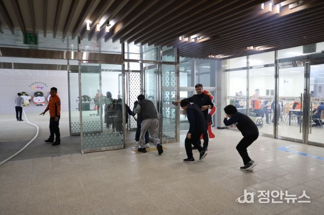 정안뉴스 박상욱 기자 | 광주광역시빛고을국민안전체험관은 24일 화재 발생 때 신속하고 효율적인 대응을 위해 북부소방서와 합동으로 소방훈련을 실시했다.
