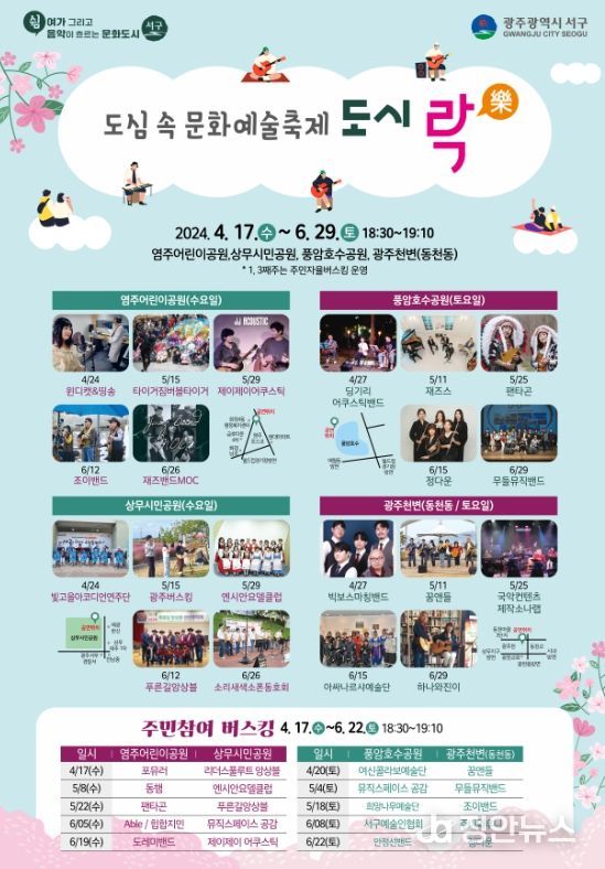 정안뉴스 박상욱 기자 | 광주광역시 서구가 도심 속에서 쉼과 힐링을 즐길 수 있는 문화의 장을 마련한다. 서구는 오는 10월까지 풍암호수공원, 상무시민공원, 염주어린이공원, 광주천변(동천동) 등 4곳에서 문화예술 축제 ‘도시 락(樂)’을 추진한다고 밝혔다.