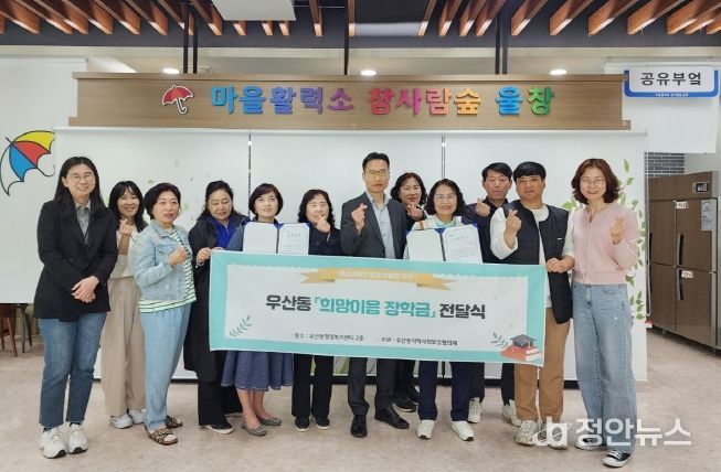 정안뉴스 박상욱 기자 | 광주 광산구 우산동 지역사회보장협의체가 지난 26일 우산동 전문계 고등학생 2명에게 ‘희망이음 장학금’ 100만 원을 전달했다.