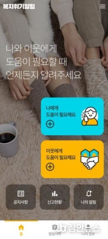 복지위기알림 앱은 보건복지부와 사회보장정보원이 주민들의 위기가구 발굴 신고를 활성화하기 위해 만든 것으로 언제 어디서든 본인 또는 이웃의 복지위기 상황 발생 시 앱을 통해 쉽게 도움을 청할 수 있다.