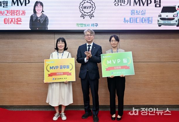 정안뉴스 박상욱 기자 | 광주광역시 서구가 2024년 상반기 MVP팀으로 홍보실 뉴미디어팀, 4월 MVP 공무원으로 보건행정과 이지은 의약관리팀장을 선정했다.