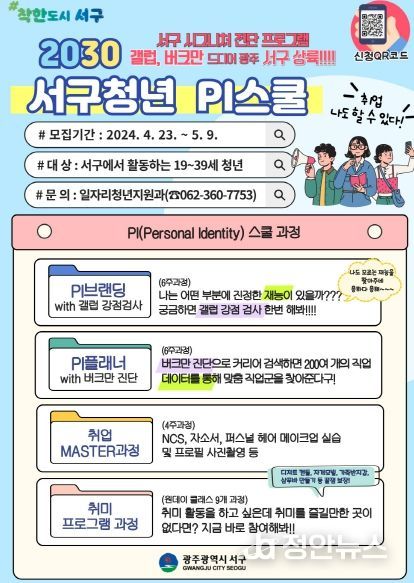 정안뉴스 박상욱 기자 | 광주광역시 서구가 청년들의 진로 찾기를 지원하기 위해 오는 9일까지 ‘2030 서구 청년 PI스쿨’참여자를 모집한다.