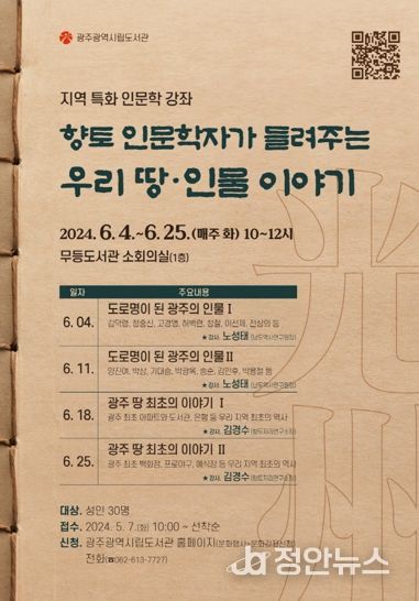 정안뉴스 박상욱 기자 | 광주광역시립무등도서관은 오는 6월 한달간 매주 화요일 오전 10시 지역민을 대상으로 지역 특화 인문학 강좌 ‘향토 인문학자가 들려주는 우리 땅‧인물 이야기’를 운영한다.