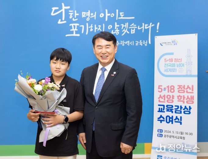 정안뉴스 박상욱 기자 | 이정선 교육감이 13일 오후 4시30분 광주시교육청 교육감실에서 5·18 왜곡 게임을 제보한 초등학생에게 교육감상을 시상했다.