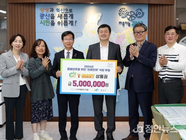 정안뉴스 박상욱 기자 | ‘와이마트’ 부설 사단법인 피플위드피플이 16일 광산구 ‘천원한끼’ 식당 운영을 돕기 위해 500만 원 상당의 ‘와이마트 상품권’을 후원했다.