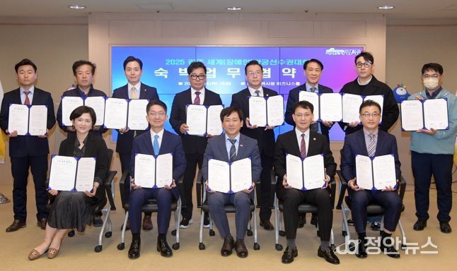 정안뉴스 박상욱 기자 | 광주광역시는 16일 오후 시청 비즈니스룸에서 홀리데이인광주호텔, 라마다플라자광주호텔, 센트럴광주호텔&레지던스 등 광주지역 14개 호텔과 ‘2025 광주 세계(장애인)양궁선수권 대회의 성공 개최를 위한 숙박 업무협약’을 체결했다.