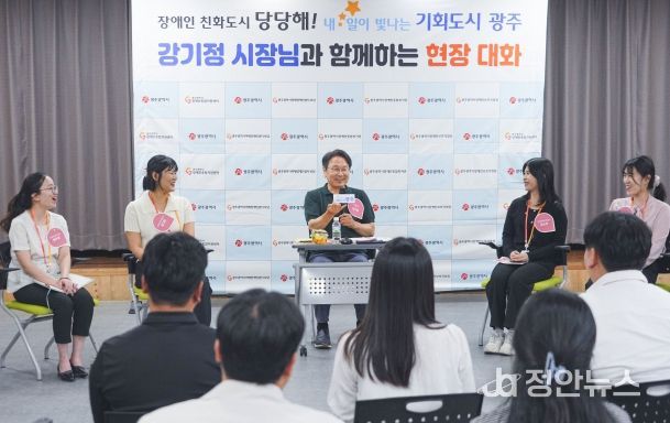 이날 현장대화에 앞서 강기정 시장은 장애인복지관 체육시설과 장애인보호작업장을 찾아 직원과 이용자들을 격려했다. 또 청각·언어장애인과 의사소통을 위한 기본 에티켓, 인사‧자기소개를 위해 수어를 배우는 시간도 가졌다.