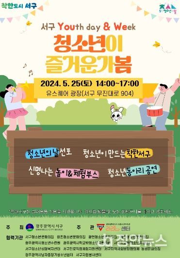 정안뉴스 박상욱 기자 | 광주광역시 서구가 청소년들의 권익 보호와 행복한 삶을 지원하기 위해 광주 최초로 5월 마지막 토요일을 ‘서구 청소년의 날’로 지정하고, 5월 마지막 일주일을 ‘청소년 주간’으로 운영한다.