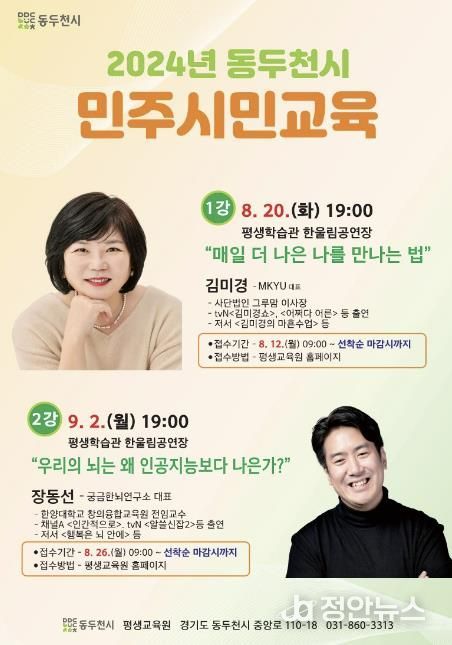 정안뉴스 박상욱 기자 | 동두천시는 오는 8월 20일, 9월 2일 19시 평생학습관에서 김미경, 장동선 강사를 초청해 ‘매일 더 나은 나를 만나는 법’, ‘우리의 뇌는 왜 인공지능보다 나은가?’라는 주제로 민주시민교육을 진행한다.