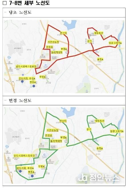 정안뉴스 박상욱 기자 | 안성시는 공도읍 일원 도로 신규 개통 및 아파트 입주에 따라 시민들의 대중교통 이용 편의를 위하여 8월 19일부터 7-8번 시내버스 노선을 개편한다고 밝혔다.