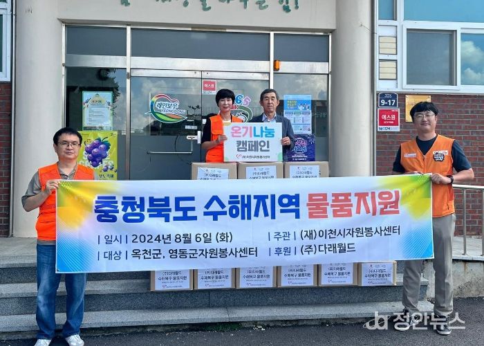 정안뉴스 박상욱 기자 | 이천시자원봉사센터는 8월 6일 집중호우로 피해를 본 충청북도 옥천군, 영동군 지역에 후원 물품을 전달했다.