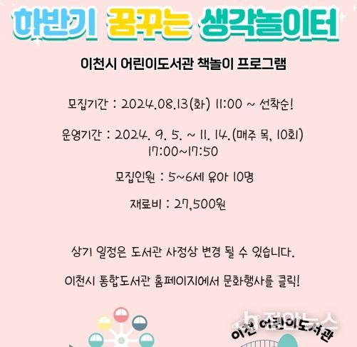 운영 기간은 9월 5일부터 11월 14일까지이며 매주 목요일에 5세와 6세 유아 10명을 대상으로 17시에서 17시 50분까지 운영한다. 또한 프로그램 수강료는 무료이고 재료비는 개인이 부담한다. 수강 신청은 8월 13일 오전 11시부터 이천시통합도서관 홈페이지를 통해 할 수 있다.