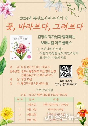 정안뉴스 박상욱 기자 | 김포시 통진도서관이 독서의 달을 맞아 오는 9월 6일 9월 27일까지 매주 금요일 14시부터 통진도서관 2층 세미나실에서 ‘꽃, 바라보다, 그려보다’ 프로그램을 운영한다.