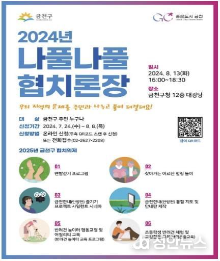 정안뉴스 박상욱 기자 | 금천구는 오는 13일 오후 4시 구청 12층 대강당에서 지역주민과 협치회의 위원, 관련 기관 등 100여 명이 참석하는 주민참여형 민관 합동 공론장 ‘나풀나풀 협치론장’을 개최한다고 밝혔다.