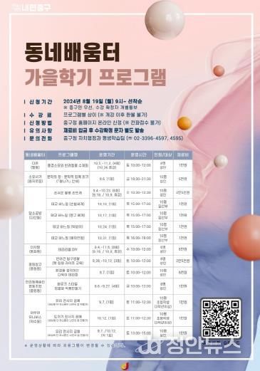 정안뉴스 박상욱 기자 | 서울 중구가 9월부터 11월까지 진행되는 동네배움터 가을학기 프로그램 수강생을 모집한다. 이번 학기엔 총 7곳에서 13개의 프로그램을 운영한다.