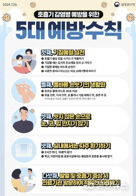 여름철에는 에어컨 사용으로 실내 환기가 부족하고, 휴가철 사람 간 접촉이 늘어나는 만큼 호흡기 감염병이 유행하기 쉽다. 호흡기 질환을 예방하기 위해서는 ▲기침 예절(입 가리기, 마스크 쓰기 등) 실천 ▲올바른 손씻기 생활화 ▲씻지 않은 손으로 눈, 코, 입 만지지 않기 ▲실내 자주 환기하기 ▲의심 증상 시 의료기관 방문하기 등의 예방수칙을 준수해야 한다.