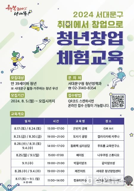 정안뉴스 박상욱 기자 | 서대문구는 청년들이 취미를 발전시켜 창업할 수 있도록 ‘2024 서대문구 청년창업 체험교육’을 실시한다고 8일 밝혔다.