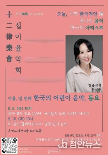정안뉴스 박상욱 기자 | 의정부음악도서관은 9월 5일과 12일 이틀에 걸쳐 본격 음악감상 프로그램 십이율악회(十二律樂會)의 ‘한국의 어린이 음악, 동요’를 운영한다.