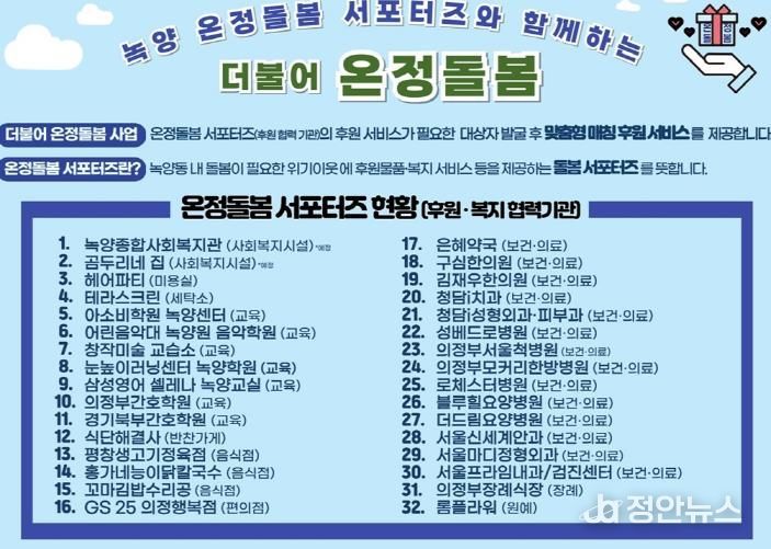 더불어 온정돌봄 사업의 후원 및 복지 서비스 협력기관은 ▲헤어파티(미용실) ▲테라스크린(세탁소) ▲식단해결사(반찬 가게) ▲평창생고기정육점(음식점) ▲홍가네능이닭칼국수(음식점) ▲꼬마김밥수리공(음식점) ▲GS25 의정행복점(편의점) ▲아소비학원 녹양센터(학원‧교습소) ▲어린음악대 녹양원 음악학원(학원‧교습소) ▲창작미술교습소(학원‧교습소) ▲눈높이러닝센터 녹양학원(학원‧교습소) ▲삼성영어 셀레나 녹양교실(학원‧교습소) ▲의정부간호학원(학원‧교습소) ▲경기북부간호학원(학원‧교습소) ▲은혜약국(약국) ▲구심한의원(한의원) ▲김재우한의원(한의원) ▲청담i치과(치과) ▲청담i성형외과‧피부과(의원) ▲성베드로병원(병원) ▲의정부서울척병원(병원) ▲의정부모커리한방병원(병원) ▲로체스터병원(병원) ▲블루힐요양병원(병원) ▲더드림요양병원(병원) ▲서울신세계안과(의원) ▲서울마디정형외과(의원) ▲서울프라임내과/검진센터(의원) ▲의정부장례식장(장례) ▲롬플라워(원예) ▲녹양종합사회복지관(사회복지시설) ▲곰두리네 집(사회복지시설)이다.