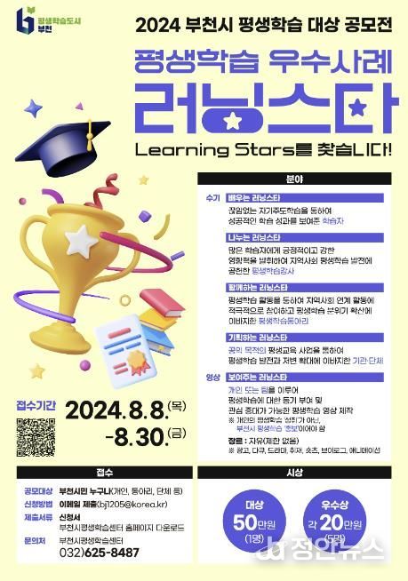 정안뉴스 박상욱 기자 | 부천시평생학습센터는 오늘 8월 30일까지 ‘2024년 제10회 부천시 평생학습 대상(러닝스타) 공모전’을 개최한다.