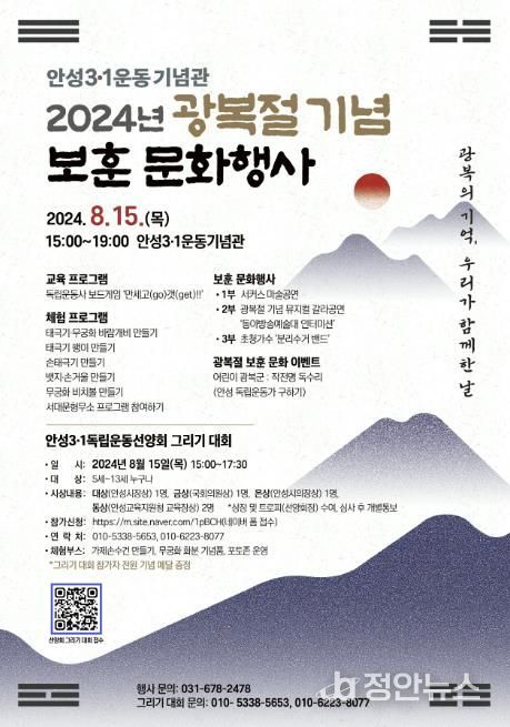 정안뉴스 박상욱 기자 | 안성시 3·1운동기념관은 오는 8월 15일 ‘2024년 광복절 기념 보훈 문화행사’를 개최한다.