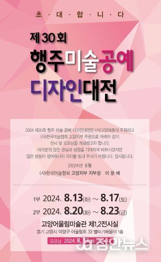 정안뉴스 박상욱 기자 | 고양특례시 미술협회가 주관하는 ‘제30회 고양 행주 미술·공예·디자인 대전’수상작 전시회가 오는 8월 13일부터 23일까지(18, 19일 휴관) 고양어울림누리 어울림미술관에서 개최된다.