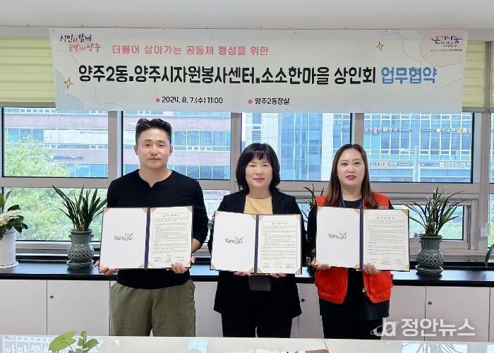 정안뉴스 박상욱 기자 | 양주2동이 지난 7일 양주시자원봉사센터 및 소소한 마을상인회와 함께 더불어 살아가는 공동체 형성이라는 공동 목표로 업무협약을 체결했다고 밝혔다.