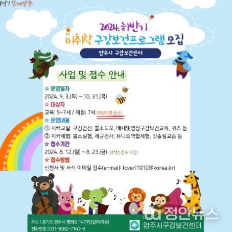 정안뉴스 박상욱 기자 | 양주시가 오는 12일부터 23일까지 관내 구강보건센터에서 ‘하반기 똑똑이 치카 교실 및 재미있는 치카 체험’ 프로그램 참여자를 모집한다고 밝혔다.