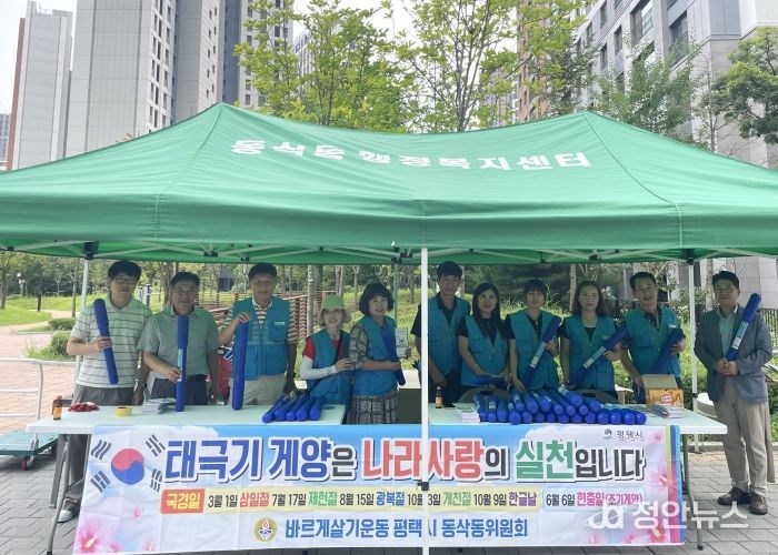 정안뉴스 박상욱 기자 | 평택시 바르게살기운동 동삭동위원회는 다가오는 광복절을 맞아 광복절의 의미를 되새기고자 지난 8일 평택센트럴자이 3단지에서 태극기 나눔 행사를 진행했다.