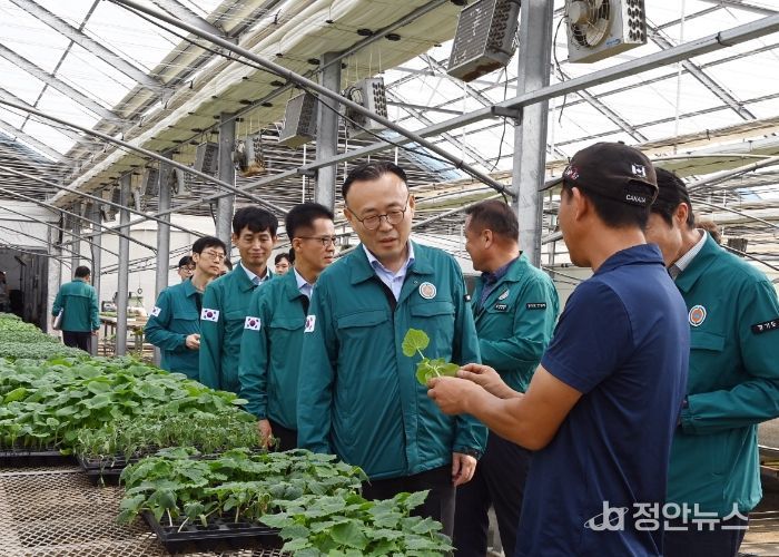 정안뉴스 박상욱 기자 | 지난 8월 8일, 안성시는 행정안전부와 합동으로 안성시 미양면 갈전리 46-2에 위치한 조이프러그 육묘장을 방문하여 농업 현장의 폭염 대비 상황과 현장 근로자와 외국인 근로자의 안전대책을 점검했다.