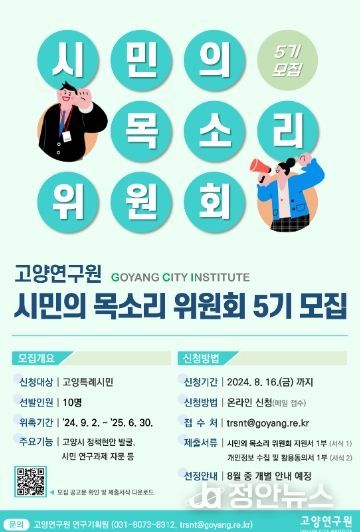 정안뉴스 박상욱 기자 | 고양연구원은 고양시민의 의견을 반영한 정책전략 수립과 시민참여 활성화를 위한‘시민의 목소리 위원회’의 위원을 8월 16일까지 공개모집 한다고 밝혔다.