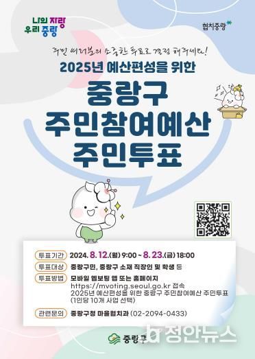 정안뉴스 박상욱 기자 | 중랑구가 오는 8월 12일부터 23일까지 2025년도 중랑구 주민참여예산 온라인 주민투표를 진행한다.