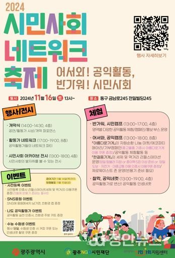 정안뉴스 기자 | 광주광역시는 시민사회와 공익활동의 의미와 가치를 공유할 수 있는 ‘2024 시민사회 네트워크 축제’를 오는 16일 전일빌딩245에서 개최한다.