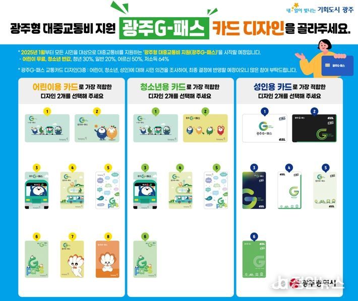 광주광역시는 광주G-패스 카드 디자인에 대한 시민의 의견을 수렴하기 위해 18일부터 22일까지 광주온(ON) 설문과 오프라인 투표를 함께 실시한다.