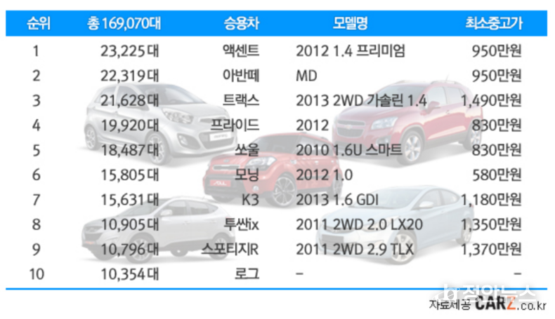 중고차 사이트 카즈와 한국 자동차 산업 협회의 보고서를 통해서 올 한 해 어떤 차량의 수출이 가장 많았었는지 확인하였다. 솔루션저널리즘 시사 위크에 따르면 지난 3월 가장 많이 수출된 차량의 1위는 현대자동차의 엑센트 차량이다. 그중에서 12년식 차량이 가장 많은 판매를 기록하였다. 2위는 현대차 아반떼 차량이다. 3위는 쉐보레 트렉스 차량이다. 2013년형이 가장 많은 판매를 기록했다고 한다. 다음 4위는 기아 프라이드 차량이다. 이 차량은 12년식이 가장 많이 거래되었다. 5위와 6위를 차지한 차량은 기아 쏘울과 모닝이 차지했다고 한다. 모닝과 스