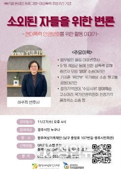 여성폭력추방주간(11월25일~12월1일)을 맞아 열리는 이번 특강에서는 하주희 법무법인 율립 대표변호사가 ‘소외된 자들을 위한 변론’을 주제로 젠더폭력 인권보호를 위한 여러 활동에 대해 이야기를 나눈다.