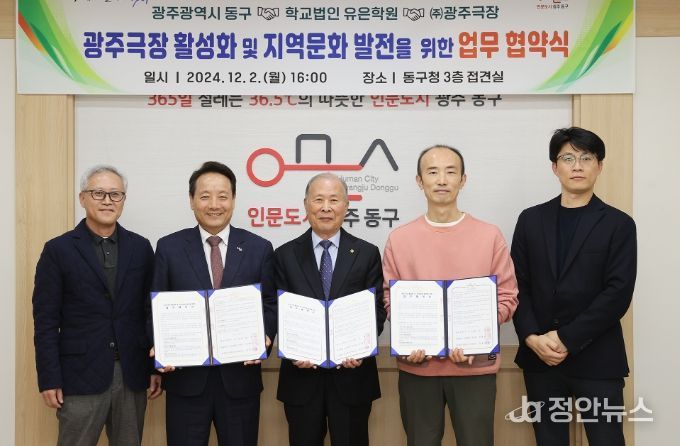 정안뉴스 기자 | 광주 동구는 지난 2일 학교법인 유은학원, ㈜광주극장과 ‘광주극장 활성화 및 지역문화 발전’을 위한 업무협약을 체결했다고 밝혔다.