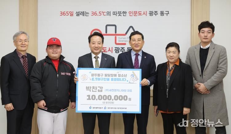 정안뉴스 기자 | 광주 동구는 SM그룹에 이어 ㈜세진엔지니어링이 발달장애 청소년으로 구성된 E.T야구단에 1천만 원을 기부했다고 밝혔다.