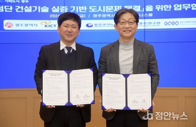 광주광역시는 13일 시청 비즈니스룸에서 한국건설기술연구원과 ‘첨단 건설기술 실증 기반 도시문제 해결을 위한 업무협약’을 체결했다.