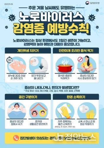 정영화 복지건강국장은 “겨울철 노로바이러스 감염증을 예방하기 위해서는 손 씻기 등 예방수칙 준수와 안전하게 조리된 음식 섭취가 중요하다”며 “영유아 보육시설이나 학교 등에서 집단환자 발생 때는 가까운 보건소로 즉시 신고해달라”고 당부했다.