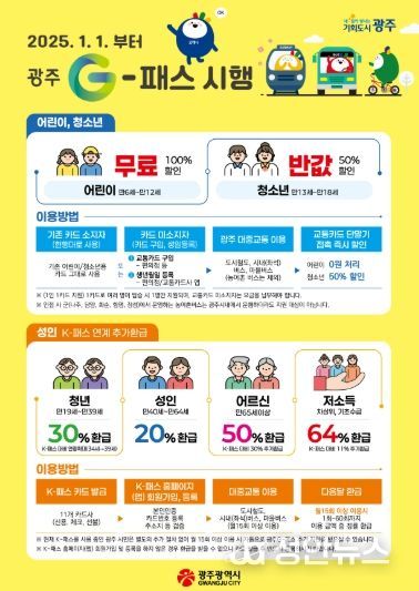 특히 광주지역 어린이는 무료, 청소년은 반값으로 대중교통을 이용할 수 있으며, 어르신과 저소득층은 기존 K-패스 환급과 광주G-패스 추가할인을 더해 각각 50%, 64% 할인 혜택을 받는다.