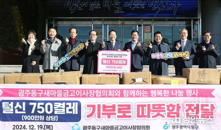 정안뉴스 기자 | 광주 동구는 연말을 맞아 동구 새마을금고이사장협의회에서 19일 지역사회의 취약계층을 위해 9백만 원 상당의 털신 750켤레를 전달했다고 밝혔다.